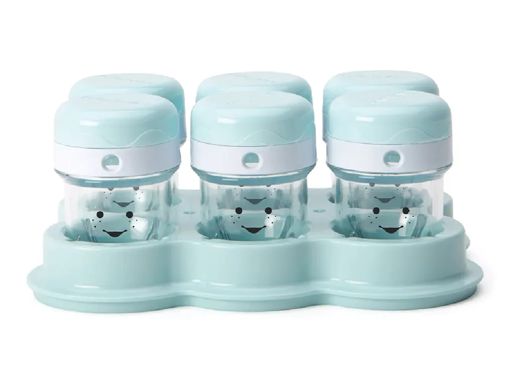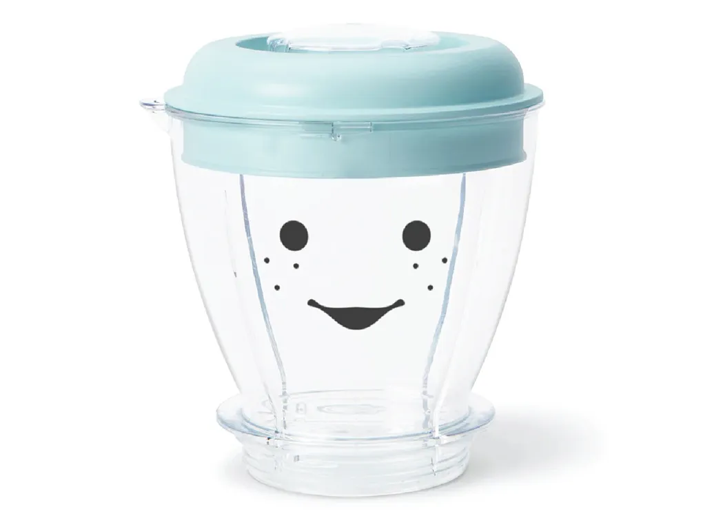 Блендер Nutribullet Baby комплектуется шестью емкостями для хранения готового продукта. За счет продуманной конструкции на каждой из них можно указать собственную «дату изготовления», а затем поместить в холодильник или морозилку. Чтобы чашечки не потерялись и не упали, предусмотрена специальная подставка.